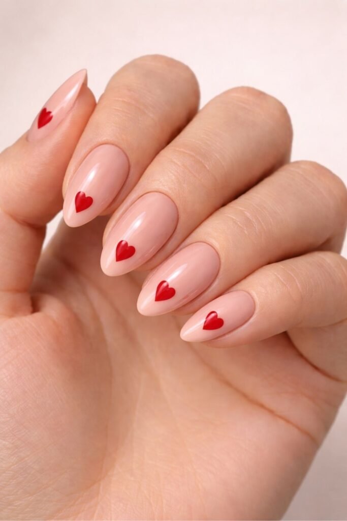 For timeless elegance that’s perfect for Valentine’s Day, you’ll want to try a nude base with scattered red hearts. This design combines sophistication with romantic sentiment, making it ideal for anyone seeking a subtle yet festive look.