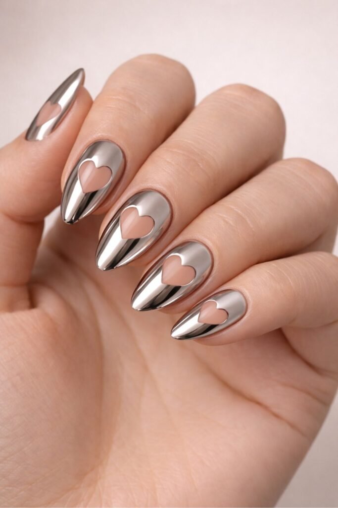 For a modern Valentine’s look that’s sure to turn heads, mirror chrome with negative-space hearts combines trendy metallics with romantic symbolism. You’ll achieve an eye-catching manicure that balances sophistication with sentiment.