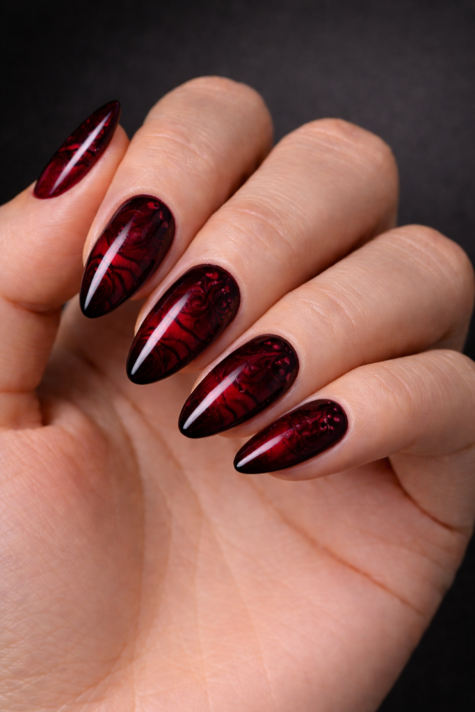 - Deep matte burgundy base – The velvety finish exudes elegance while the dark tone enhances the gothic aesthetic you’re pursuing