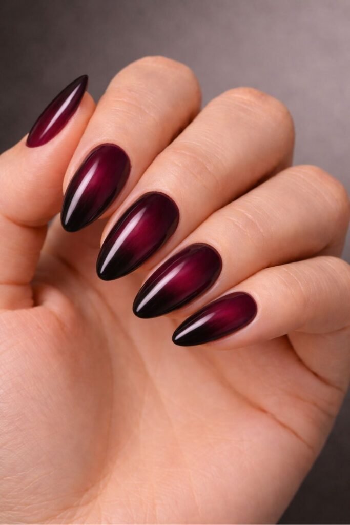 While metallics bring glamorous shine to your dark Valentine’s look, a moody burgundy and purple sunset blend offers a more atmospheric approach to romantic drama.