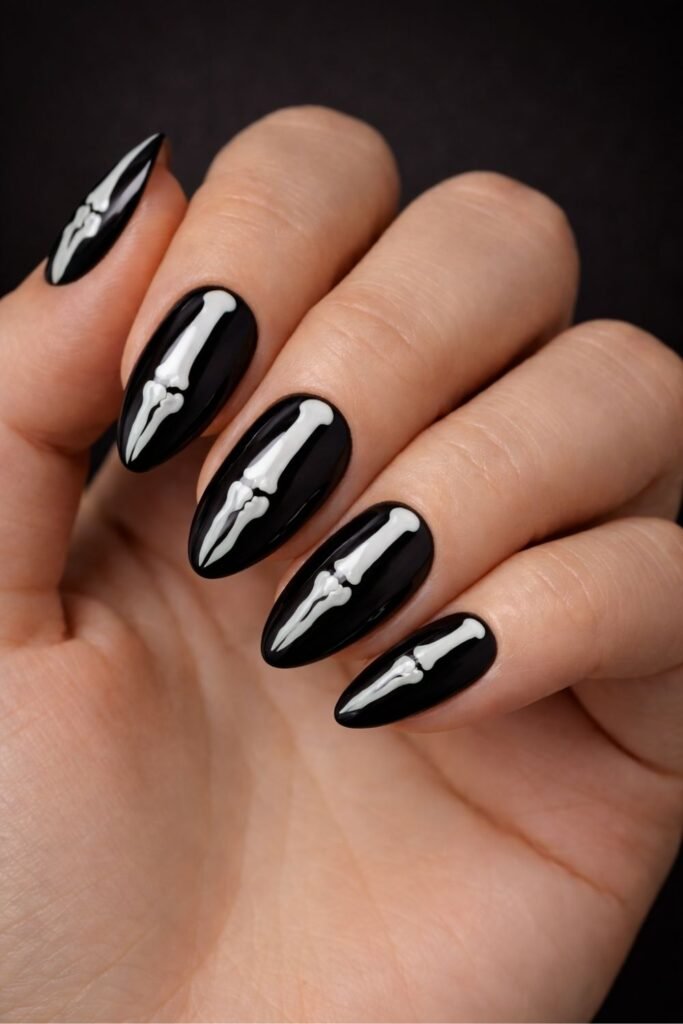 To create this look, start with two coats of matte black polish. Using a thin detail brush or nail art pen, carefully paint miniature skull shapes within heart outlines. White or silver polish works beautifully for contrast. You can arrange the skulls randomly or symmetrically, depending on your preference.